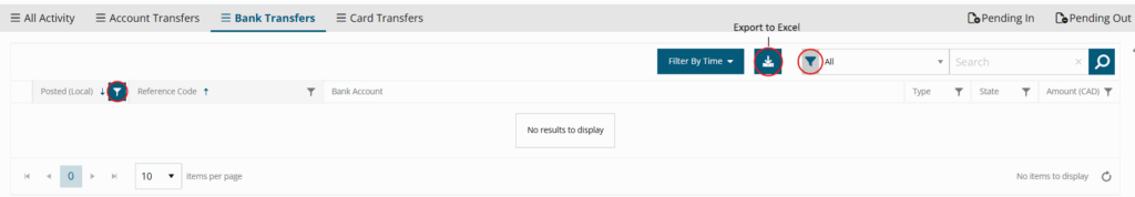 - In the Bank Transfers page, filter the information by clicking on the filter icon next to headers or use the search tool (when available) to narrow down the transactions needed in the report