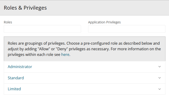 The application privileges may be left blank if the user does not need any additional privilege that is not included in one of the roles.