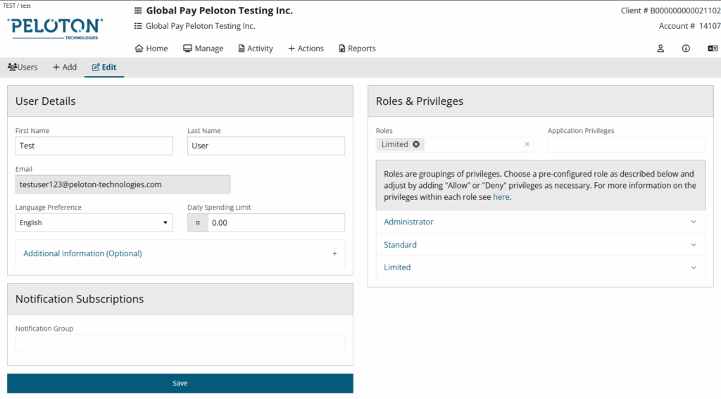- You can also edit the user’s daily spending limit. For security reasons, $30,000 is the highest limit that can be set to a user. If you require a higher limit, please contact Peloton Support team at support@peloton-technologies.com