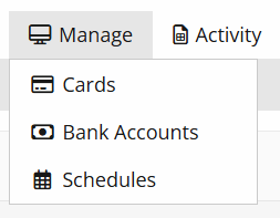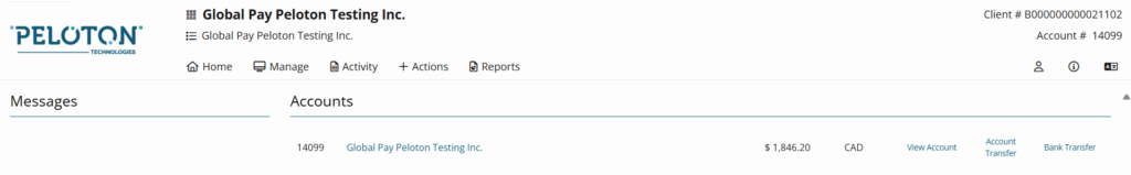 The Client Dashboard provides an overview of all the accounts available and provides quick access to common tasks at the client level such as Manage Users, Cards and Bank accounts. It also allows the user to access each individual account. You can click on “Select Account” or click on the links next to the account balances to transfer funds, process card transactions, view the account activity details, and download account reports.