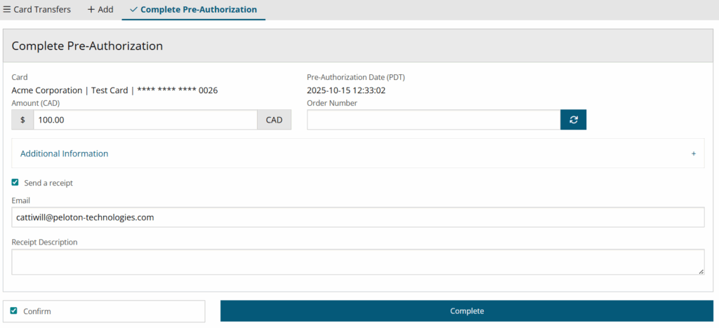 - If you want to complete just a part of the total amount pre-authorized, change the amount of the “Amount” field before clicking on “Complete”