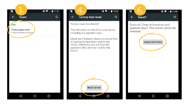 - Enter your Clover admin passcode to confirm reset, tap NEXT