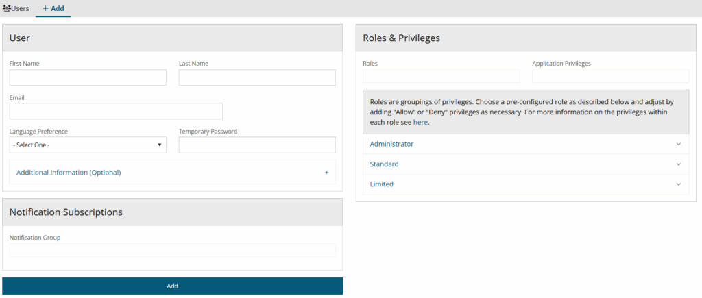 Select + Add to create a new user. You'll be required to enter their first and last name, email and provide a temporary password they can use to complete their setup.