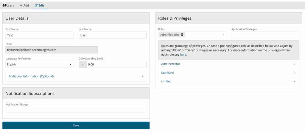 From here you'll be able to make any changes to their role, notifications, contact details. This is where you'll also set their daily spending limit. (If need over $30,000 please contact support@peloton-technologies-com